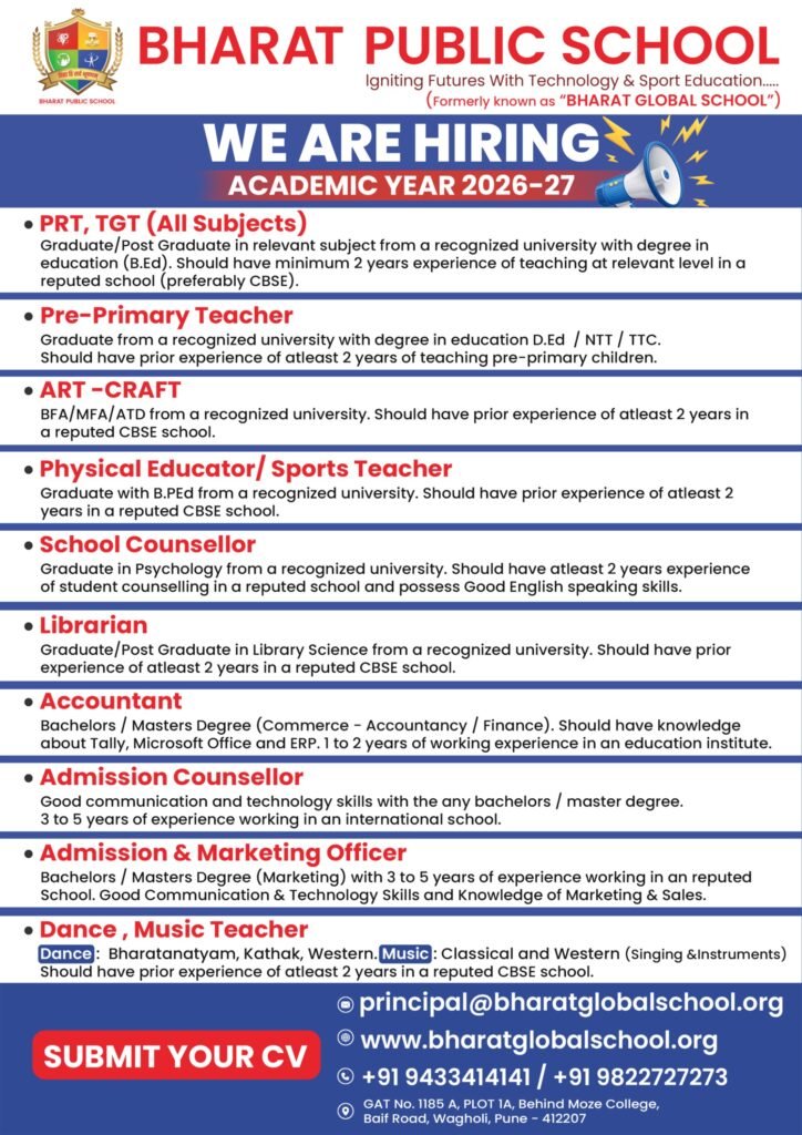 | 10 | Marathi | Graduate with B.Ed. and six-month Bridge Course recognised by NCTE | PRT / TGT | Experience in Grade I to VII |